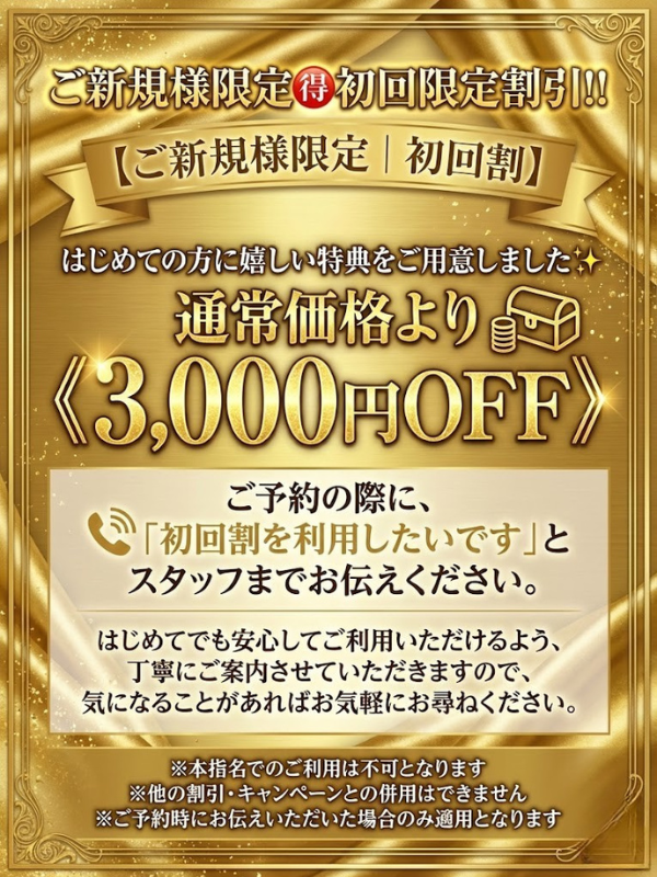 【ご新規様限定|初回割】 はじめての方に嬉しい特典をご用意しました✨ **通常価格より《3,000円OFF》**でご利用いただけます。 ご予約の際に、 📞 「初回割を利用したいです」 とスタッフまでお伝えください。 はじめてでも安心してご利用いただけるよう、 丁寧にご案内さつづきはこちら >